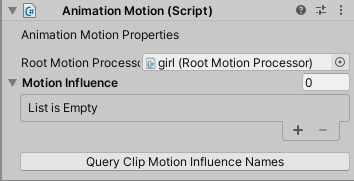 When you click in the 'Query Clip Motion Influence Names' it will generate the parameters the root motion will use to move the GameObject.